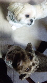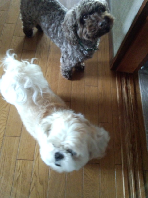 ティキは甘え上手でいつも 尻尾フリフリ抱っこ大好きですが、小太郎は下手です。尻尾ふりません!たまにピコピコやると大人達が「今、ふったんちゃう?えっ?見てへんわ~」ぐらいに驚くほどです。