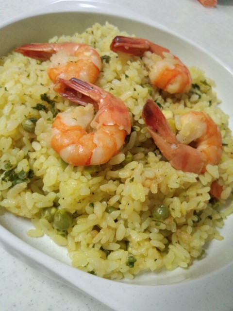 」作戦玉ねぎをみじん切りにし、オリーブ油でニンニクとエビと一緒にソテーし、あとは米と調味料と具材を入れて水控えめで炊きます。