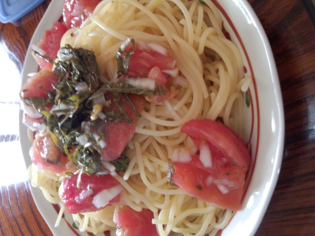 お昼、昨日のトマトがえ~具合に浸かったので冷製パスタでいただきました