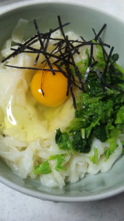 出張帰りの親方様が買ってきた稲庭うどんに今朝畑で間引いた大根葉と昨日友達が持ってきてくれたこだわり卵をのっけてかつお醤油だしでいただきました。