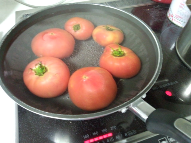 残ったトマトを湯むきして朝からトマトカレーを作りました。