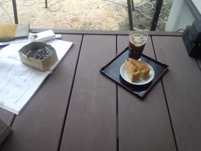 今日は親方様も休みで朝からウッドデッキ前のひさしを作っています。