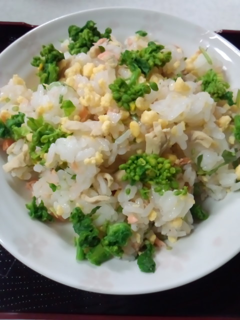 焼き鮭と三ツ葉、高野豆腐、いり卵、甘酢生姜と茹でた菜の花を混ぜ込んでいます。