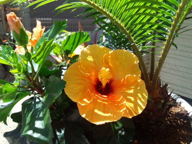 夏にぴったりのハイビスカスと寄せ植えして玄関ポーチに2つ置いていますが、連日の暑さでついに花開きました(*^o^*)