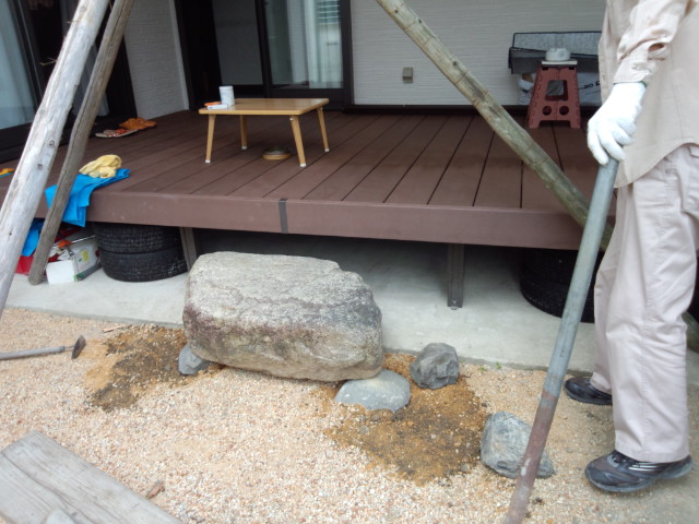 ウッドデッキから庭に降りるために実家の庭から石を運びました。