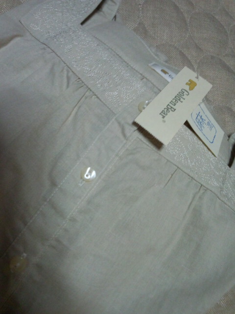 私は、ベージュだけど襟元の刺繍が可愛く半袖!パンツはふくらはぎくらいの七分パンツです