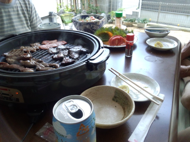 夕方、風があったのでウッドデッキにゴザ敷いて焼き肉パーティー
