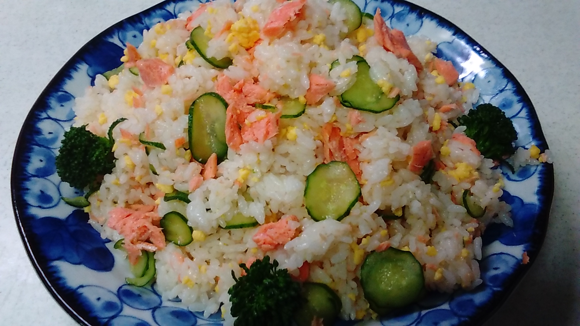 きゅうりの塩もみと玉子のそぼろと焼き鮭の身をほぐしたのとで作ります。