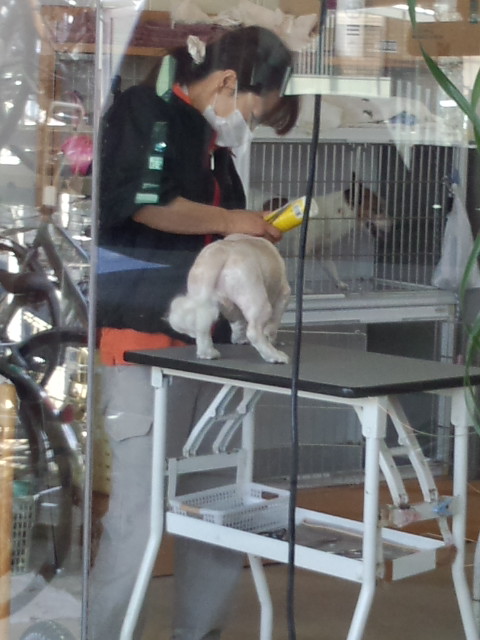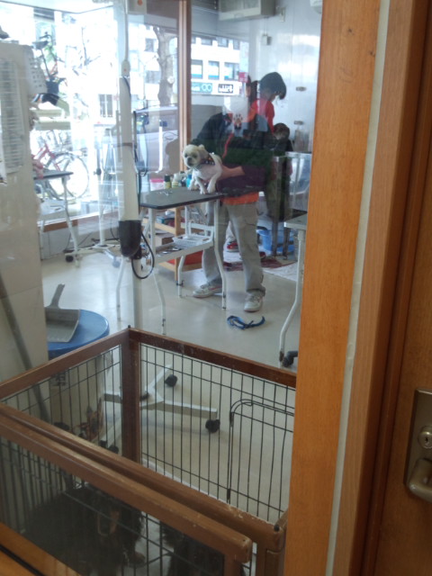 ティキはおとなしいのでトリマーさんも楽勝ですが、小太郎は、羽交い締めにされながらの悪戦苦闘です。