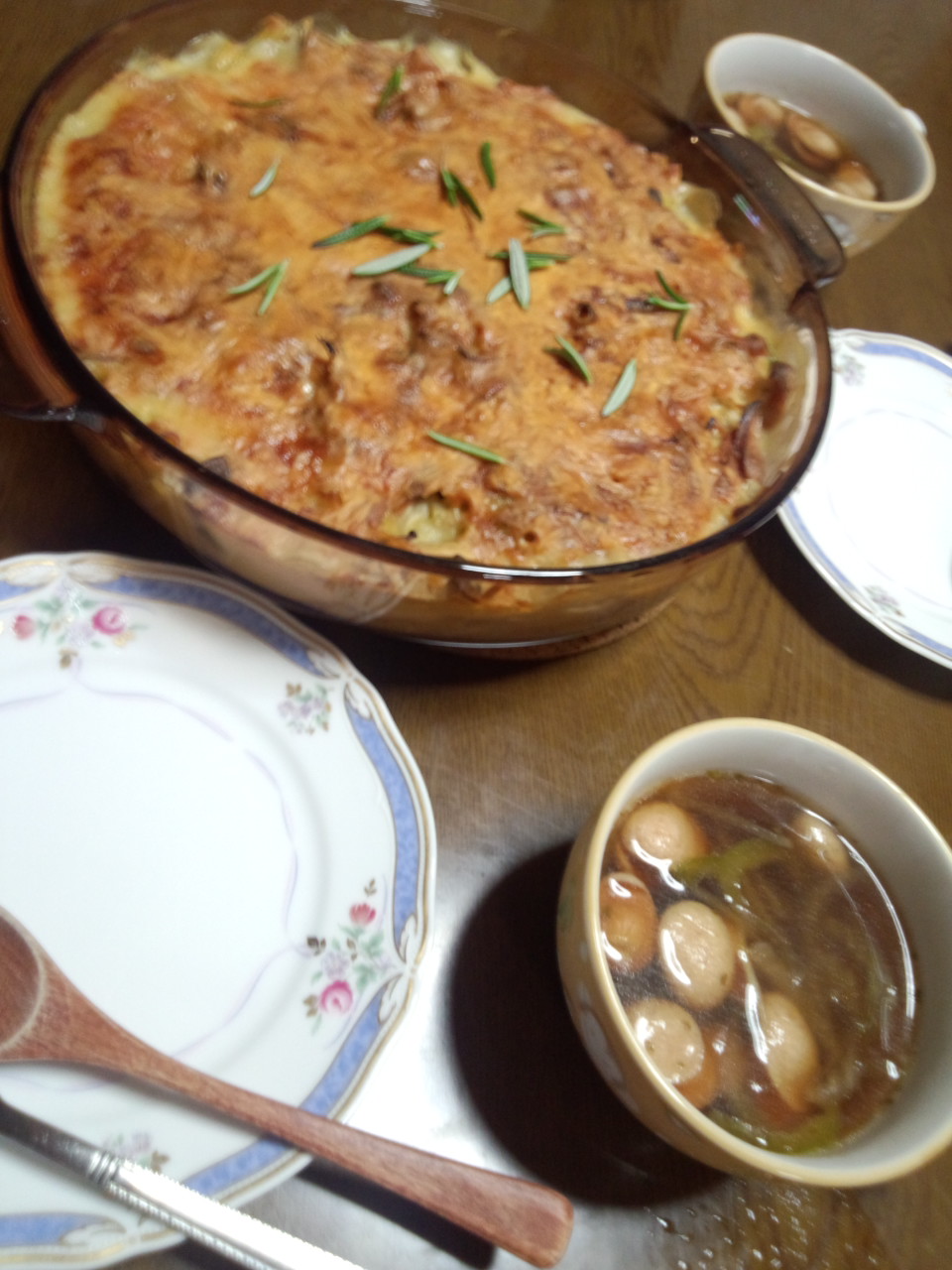 エリンギ、舞茸、しめじとキノコたっぷりグラタンとオニオンスープ♪